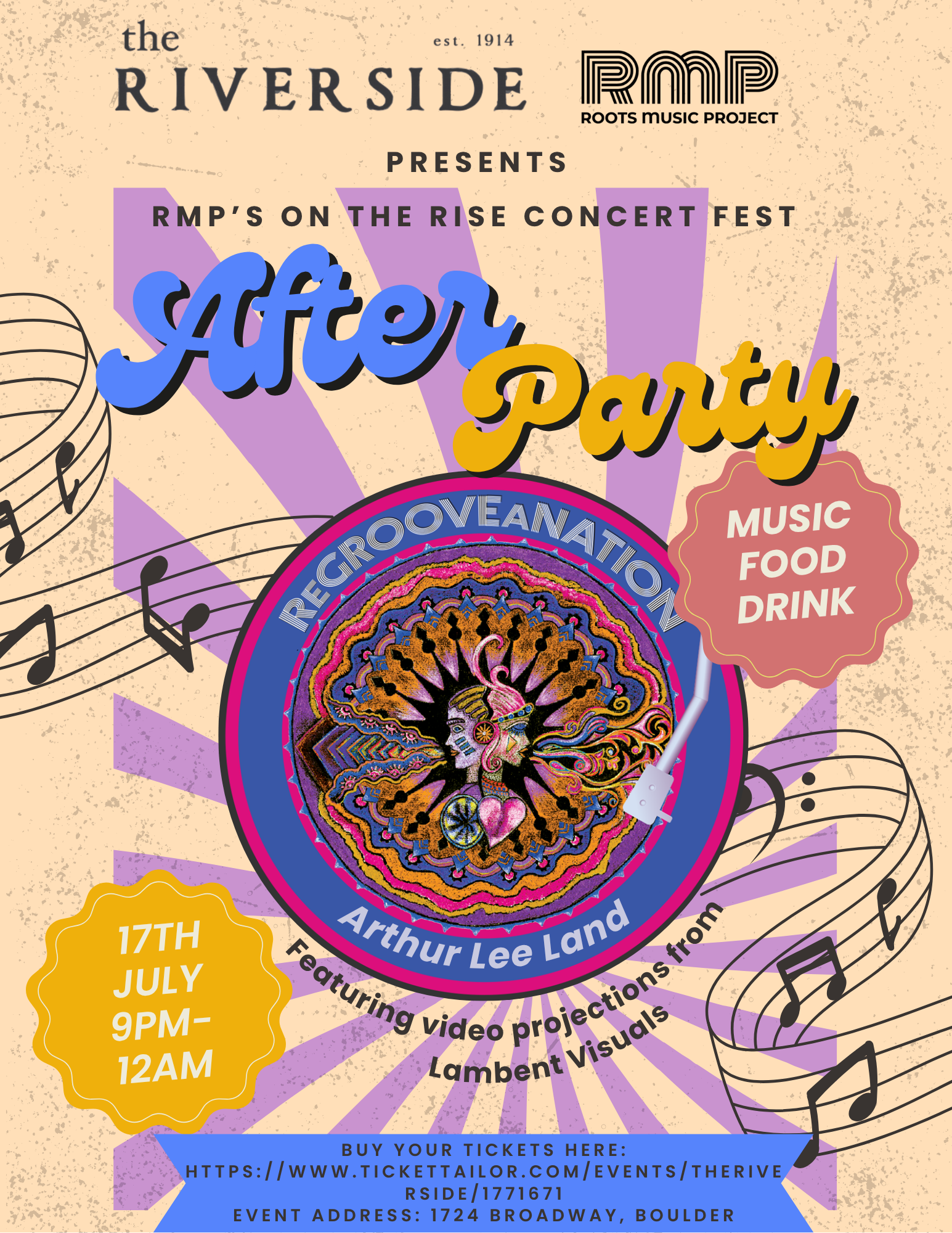 After the “On The Rise” Roots Music showcase “on the Hill,” take a short stroll down Broadway to The Riverside to continue the party with Arthur Lee Land’s ReGROOVEaNATION project. This official RMP after party features great music, delicious brews (alcoholic or NA), homemade foods, and amazing creekside vibes. Arthur Lee Land, will wow you with his latest hybrid Electronic ReMix project, ReGROOVEaNATION, an electro-Americana collaboration with local electronic producers and other artists. His live-looping and improvisation skills make this a unique show that you won’t want to miss!